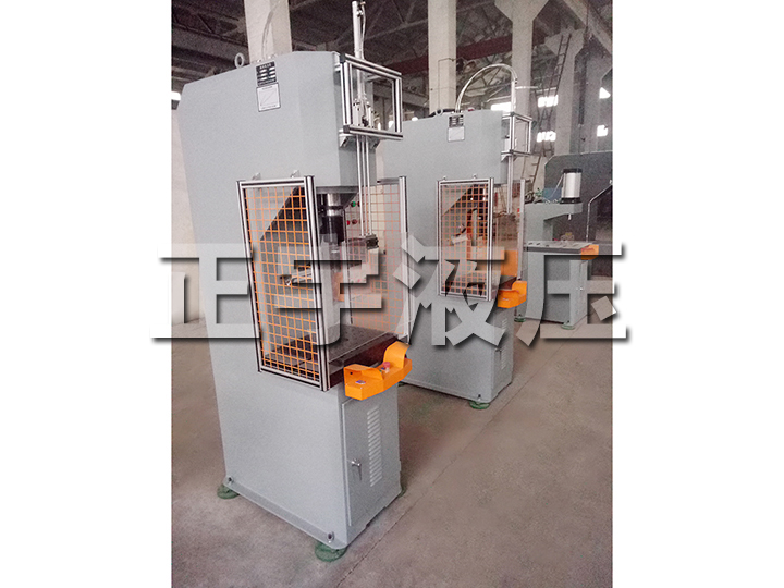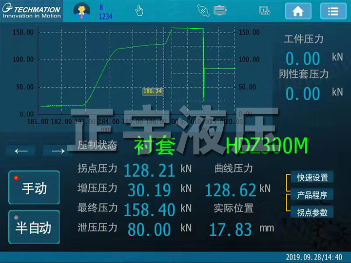 液壓機(jī)的特點(diǎn):本機(jī)器采用C型結(jié)構(gòu)上置一個液壓缸,采用高壓齒輪泵及伺服電機(jī)和驅(qū)動器控制動作,系統(tǒng)安裝有高精度壓力傳感器及位移控制尺。具有獨(dú)立的動力機(jī)構(gòu)及電氣系統(tǒng),維控PLC可編程控制器編程,按鈕集中控制,西門子觸摸屏修改編制工藝參數(shù)??蓪?shí)現(xiàn)定程,定壓的工藝功能,點(diǎn)動、單循環(huán)自動兩種操作方式。主缸上、下限位,快慢速控制采用磁柵尺控制,在觸摸屏上設(shè)定工藝參數(shù)即可,操作簡便、安全。油缸采用壓力傳感器控制,顯示壓力。